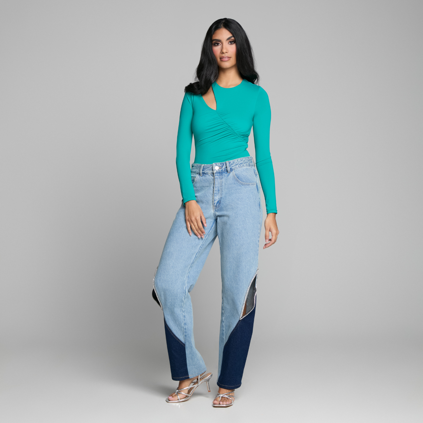 Introducing the Jada Jeans, a fresh take on a classic wardrobe staple. These jeans combine a timeless denim look with contemporary details, making them a must-have for any fashion-forward individual. Crafted from high-quality denim, these jeans feature a unique two-tone design with a lighter wash on the main body and contrasting darker denim panels at the hem, adding a modern twist to a classic silhouette.