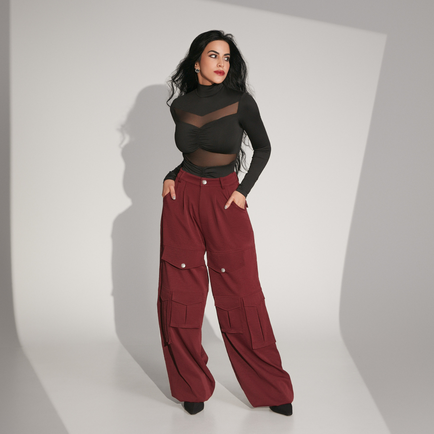 Step up your style game with the Kali Cargo Pants, a bold fusion of utility and fashion. These cargo pants are crafted from a durable, lightweight fabric in a striking burgundy color, perfect for making a statement. Designed with a high waist and wide-leg silhouette, these pants offer both comfort and a flattering fit, enhancing your figure while providing ease of movement.