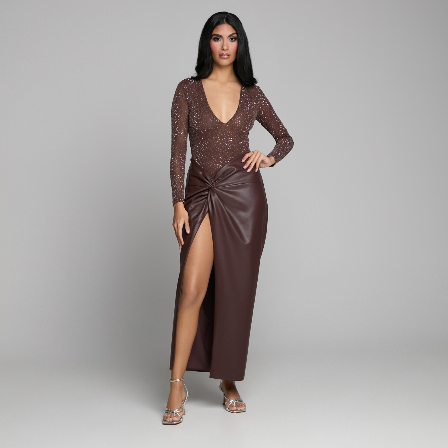 Introducing the Sienna Skirt, a masterpiece of contemporary design that effortlessly combines elegance with a bold statement. Crafted from high-quality faux leather in a rich sienna hue, this skirt features a striking front twist detail that adds depth and dimension to its sleek silhouette. The wrap design not only enhances the overall aesthetic but also provides a subtle slit for ease of movement and a hint of allure.